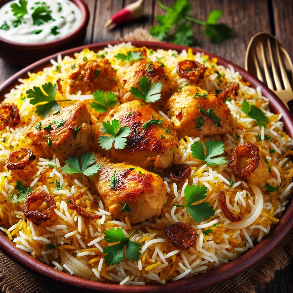 Chicken biryani is a fragrant rice dish made with marinated chicken, basmati rice, and aromatic spices. The ingredients are layered and cooked together, creating a flavorful meal, served with raita.