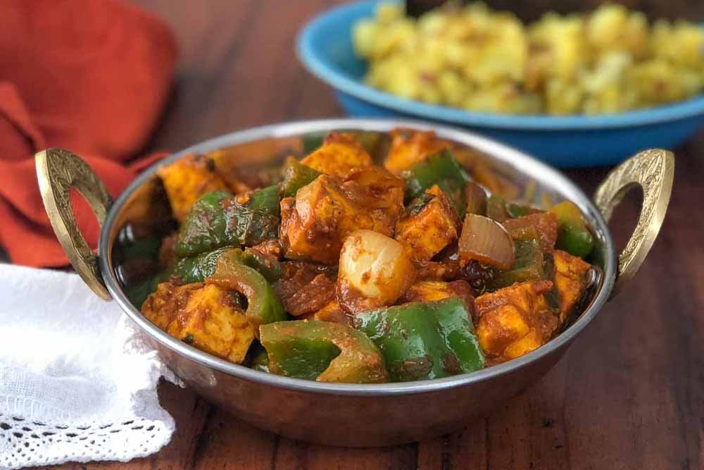 Homemade paneer cooked in a special Indian-style sauce, spiced and sautéed with fresh tomatoes, onions, and vibrant red and green peppers for a flavorful and colorful dish.